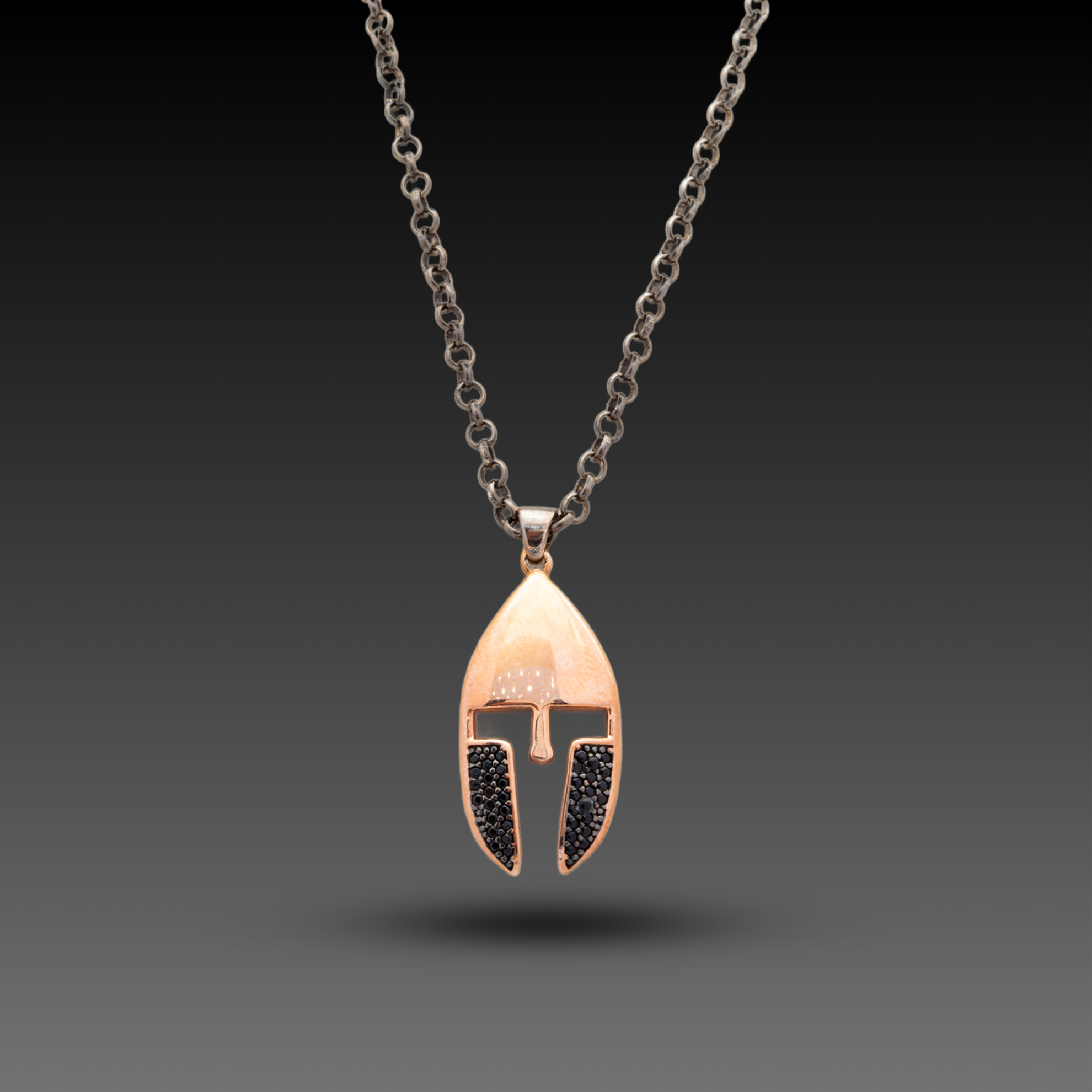 Zirkon taşlı gladyatör miğferi tasarım kolye. Maden: Altın ve Gümüş Renk: Sarı, Siyah Gramı: Altın (333) 4,52 | Gümüş (925) 5,4 Ayar: 8K (333) , 925 Gümüş Ürün Kodu: CKJN250393